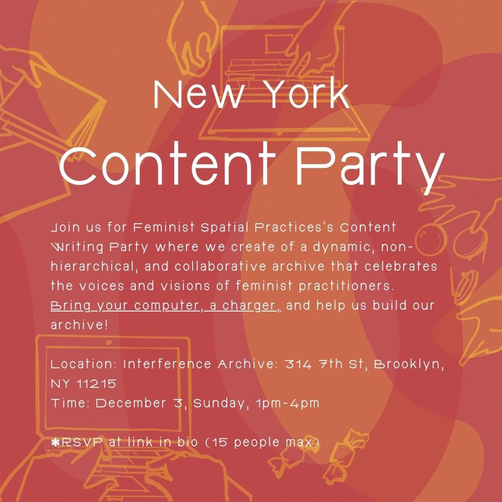 Join us for our first in-person Feminist Spatial Practice Content Writing Party - hosted by Interference Archive in Brooklyn, New York - on Sunday, December 3, from 1 pm to 4 pm. Dive into the creation of a dynamic, non-hierarchical, and collaborative archive that celebrates the voices and visions of feminist practitioners.