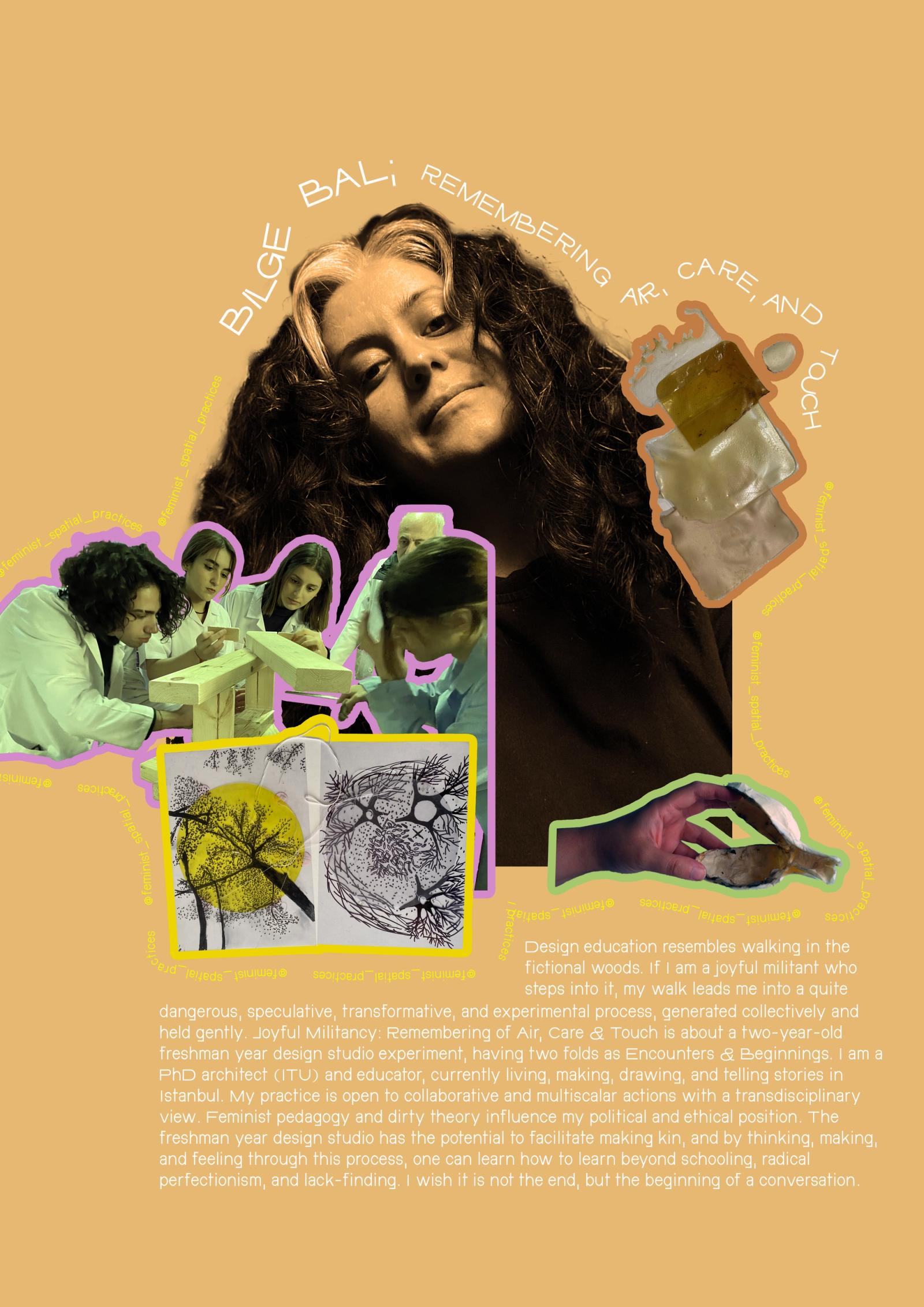 Bilge Bal is a PhD architect and educator, currently living, making, drawing, and telling stories in Istanbul. Her practice is open to collaborative and multiscalar actions with a transdisciplinary view. Feminist pedagogy and dirty theory influence her political and ethical position. She explores the autobiographical as a research methodology caring about the journey of ‘self’ to reveal both uniqueness and plurality. She has led experimental design studios and drawing studios at Istanbul Kent University since 2015: “Design education resembles walking in the fictional woods. If I am a joyful militant who steps into it, my walk leads me into a quite dangerous, speculative, transformative, and experimental process, generated collectively and held gently. Joyful Militancy: Remembering of Air, Care & Touch is about a two-year-old freshman year design studio experiment, having two folds as Encounters & Beginnings. In the studio, our stories are not about controlling things, creating atmospheres of fear, mistrust, resentment, and anger but they are about being alive, putting our stories in dialogue with each other, embracing encouragement, kindness, love, trust, and flourishing that can erase power relations. It means willing to be troubled: tracing entanglements without reducing complexities and contradictions, co-constructing a fluid geography of troubled and beautiful messiness to walk with creativity, courage, care, questions, curiosity, and experimentation. The freshman year design studio has the potential to facilitate making kin, and by thinking, making, and feeling through this process, one can learn how to learn beyond schooling, radical perfectionism, and lack-finding. I wish it is not the end, but the beginning of a conversation.”