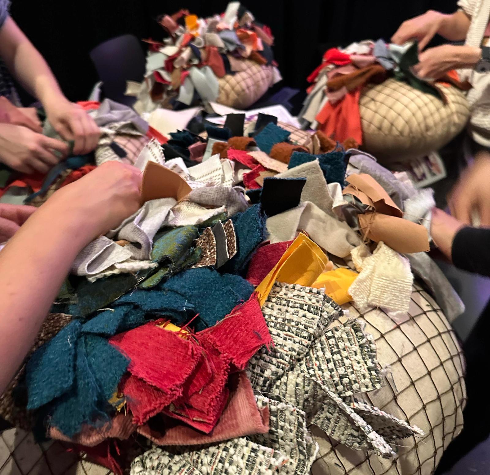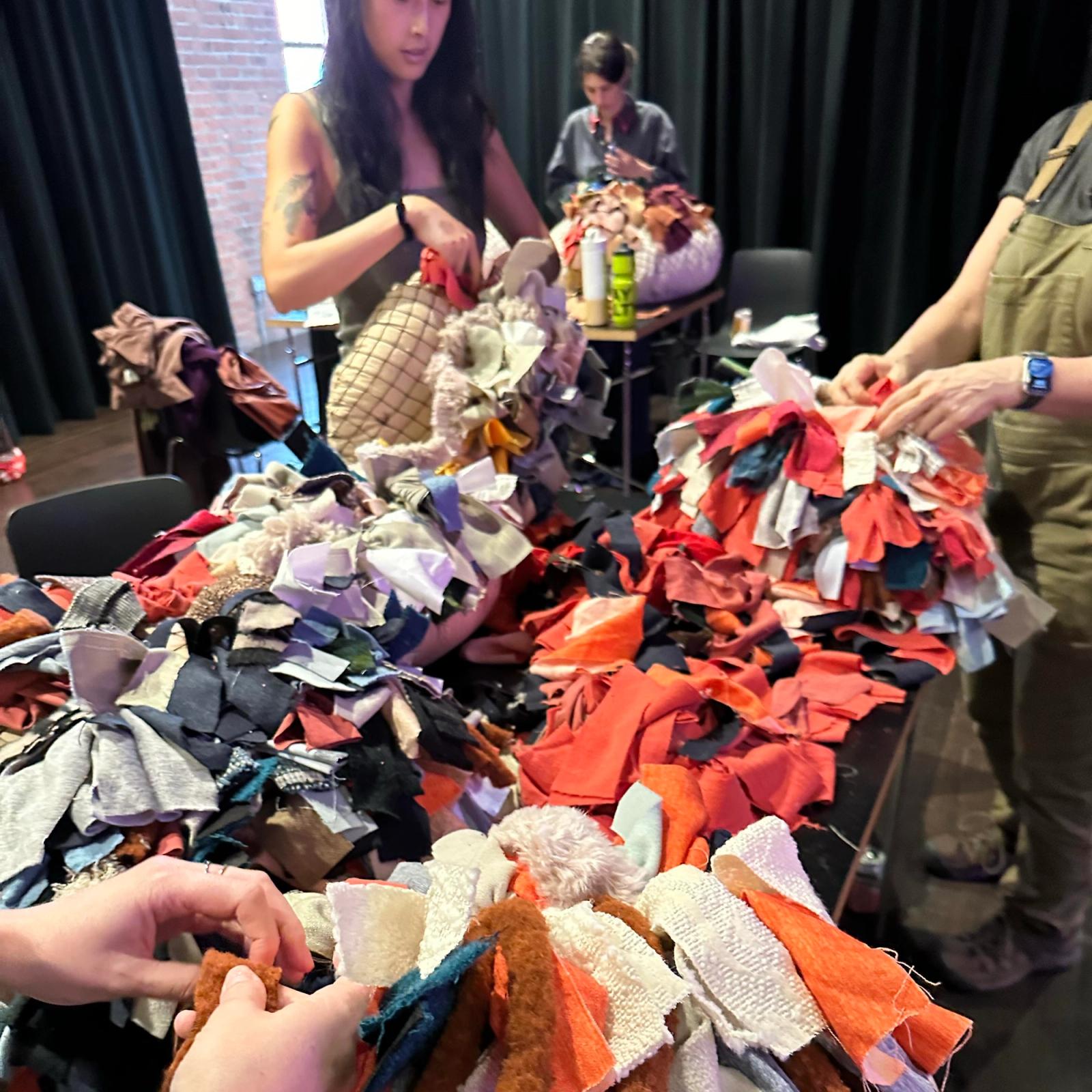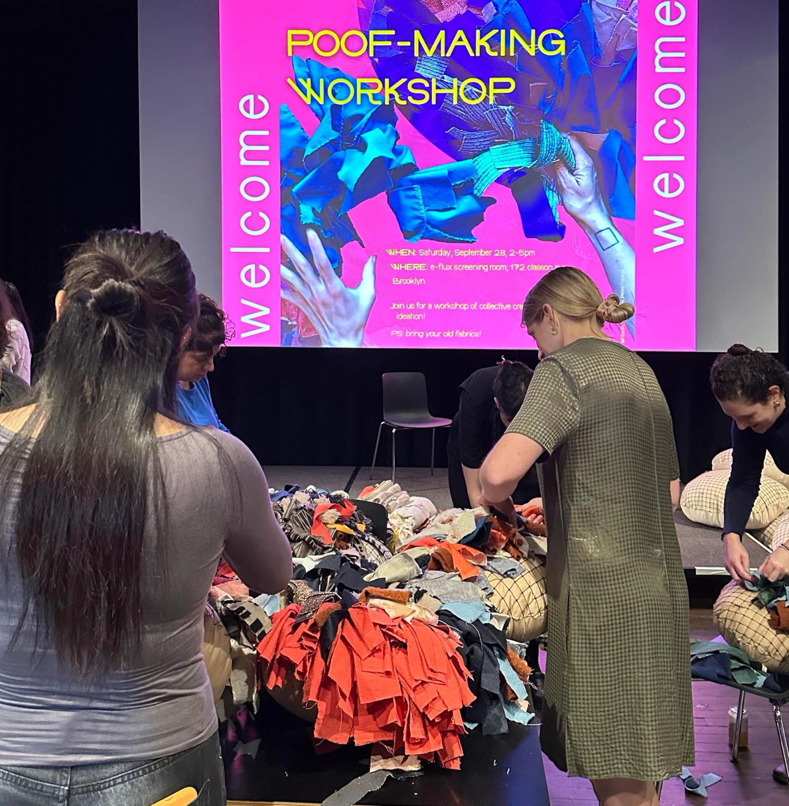 In preparation for the launch of the Feminist Spatial Practices Web Platform, FSP held a participatory workshop to make fluffy poofs for an immersive installation at the platform launch. This was a casual, open gathering where FSP members and volunteers tied fabric and chatted about feminist practices and their work. The event took place on Saturday, September 28 from 2-5pm at the e-flux screening room.
