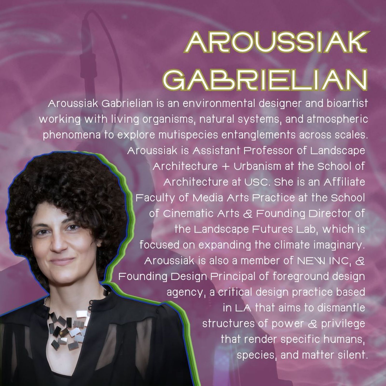 Aroussiak Gabrielian is an environmental designer and bioartist working with living organisms, natural systems, and atmospheric phenomena to explore mutispecies entanglements across scales. Her work aims to torque our imaginaries to help us rethink our interactions with both human and non-human agents on this planet. Aroussiak is Assistant Professor of Landscape Architecture + Urbanism at the School of Architecture at the University of Southern California, where she teaches design across ecologic and biologic scales. She is an Affiliate Faculty of Media Arts Practice at the School of Cinematic Arts and Founding Director of the Landscape Futures Lab, which is focused on expanding the climate imaginary. Outside of academia, Aroussiak is a member of NEW INC, the arts and technology incubator of the New Museum in New York City, and Founding Design Principal of foreground design agency, a critical design practice based in Los Angeles that aims to dismantle structures of power and privilege that render specific humans, species, and matter silent.